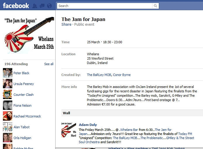 The Barley Mob in association with OxJam Ireland present the 1st of several fundraising gigs for the recent disaster in Japan featuring the finalists from the “TodayFm Unsigned” competition..The Barley mob, Sanzkrit, G-Miley and The Problematic…Doors 6:30…Adm:7euro…First band onstage @ 7..
